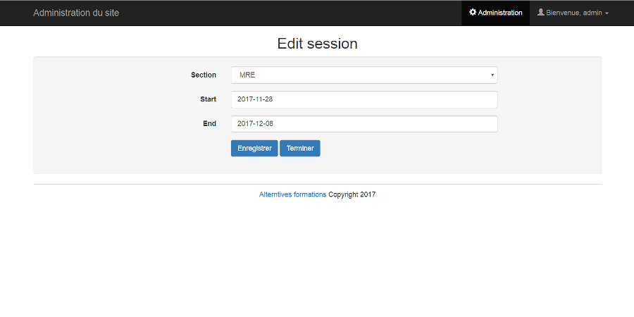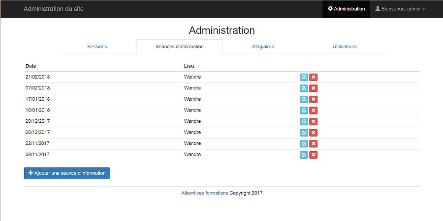 Le Back-office permet de tenir à jour les dates des sessions de formations et des séances d'information affichées sur les pages du site. Il permet également d'assurer les inscritptions en ligne des candidats aux séances d'informations.